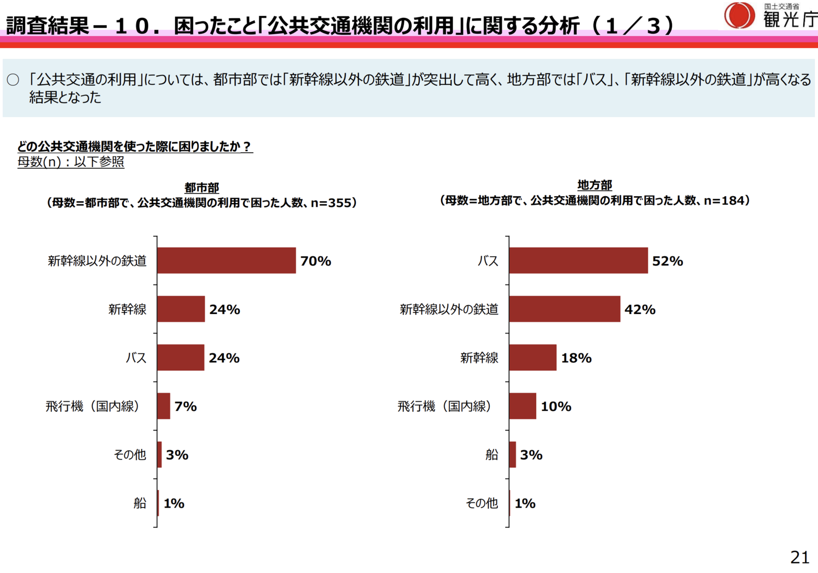公共交通機関の利用については、都市部では新幹線以外の鉄道の割合が特に高く、地方部ではバスの割合も高くなりました。