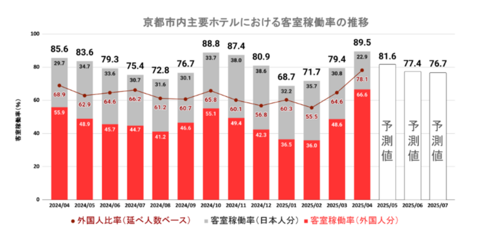 4月の京都市観光協会データによると、京都市内主要ホテル106施設における客室稼働率は89.5%で、前年同月比3.9ポイント増となりました。これは、2024年10月の88.8%を上回っており、コロナ禍以降の最高値となっています。