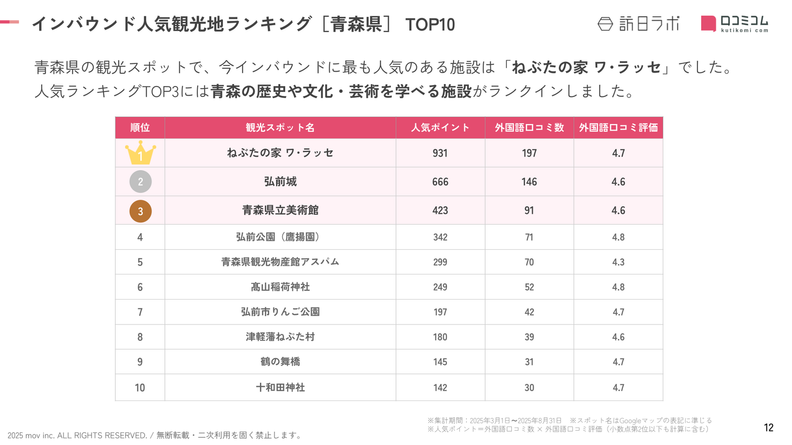 訪日ラボ・口コミコムが独自に調査した『インバウンド人気観光スポットランキング』青森編。