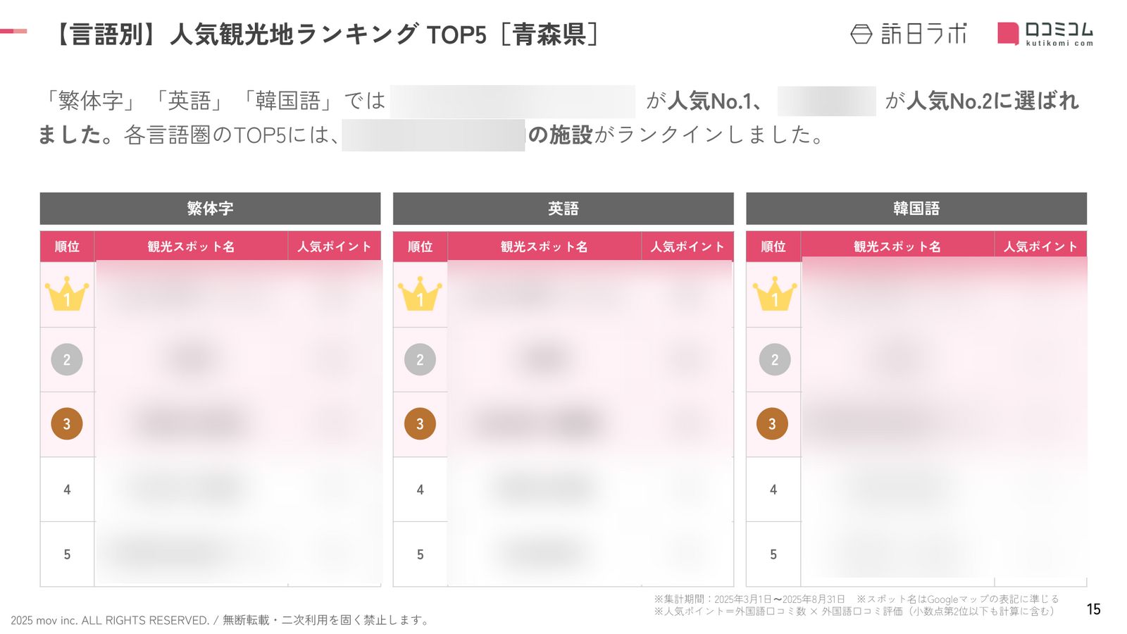 - 調査対象:訪日ラボが独自に選出した青森県の観光スポット(計1,478箇所)