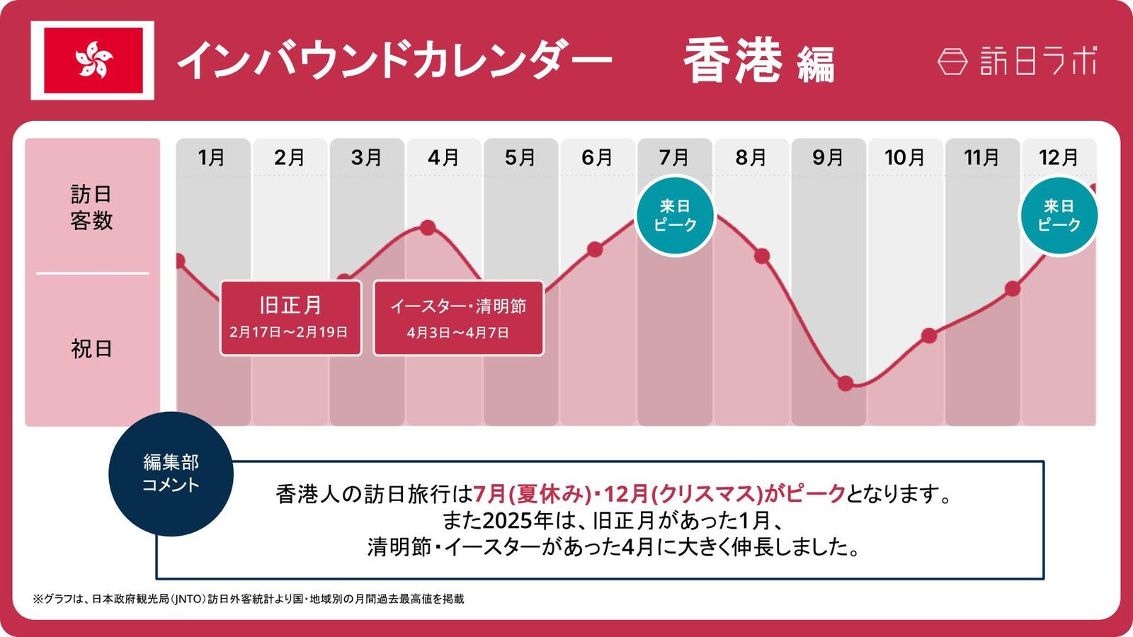 2025年は地震の噂の影響で訪日数が落ち込みましたが、2024年7月の香港人訪日客数は27.9万人、12月の香港人訪日客数は28.6万人と、この2か月で年間訪日数の2割を占めました。ほかにも、イースター休暇がある3〜4月も訪日需要が高まる傾向があります。
