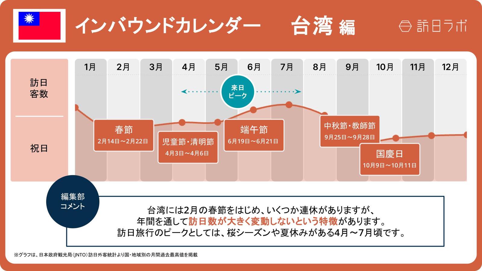 台湾人観光客の訪日需要は年間を通して高い傾向にあるものの、上記で挙げたような祝日・連休により、さらなる増加が期待できます。特に春節や夏休みは家族旅行も増加する可能性があるため、受け入れ体制の強化が求められます。