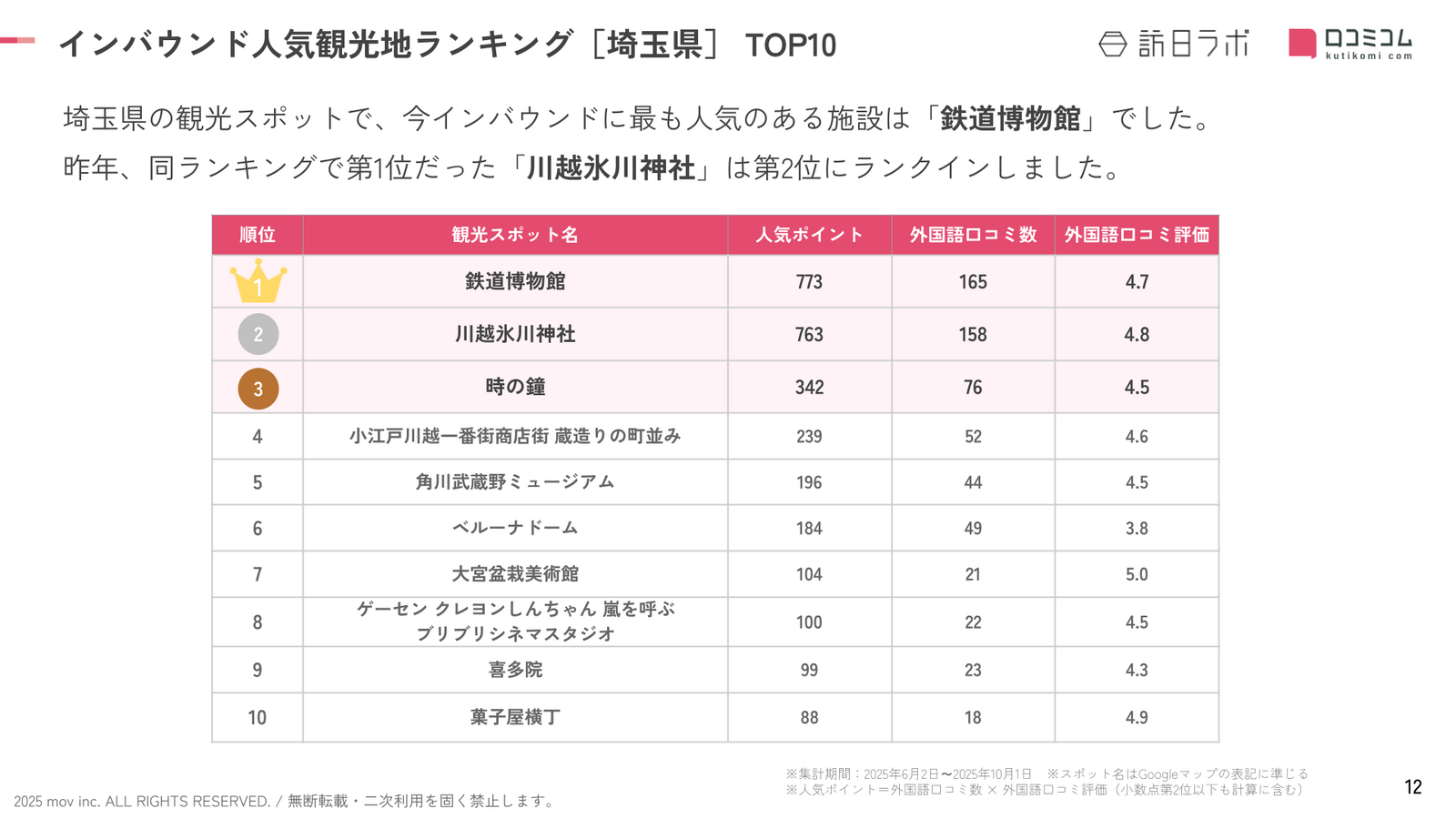 訪日ラボ・口コミコムが独自に調査した『インバウンド人気観光スポットランキング』埼玉編。