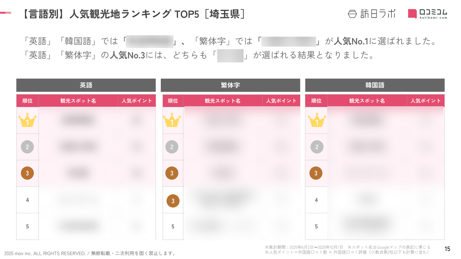 インバウンドランキング[埼玉 編]では、以下の内容が明らかになりました。