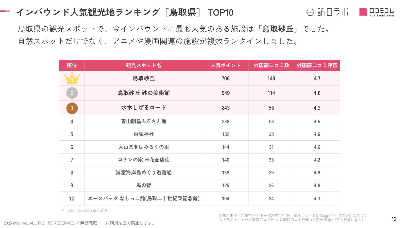 インバウンドランキング[鳥取 編]では、以下の内容が明らかになりました。