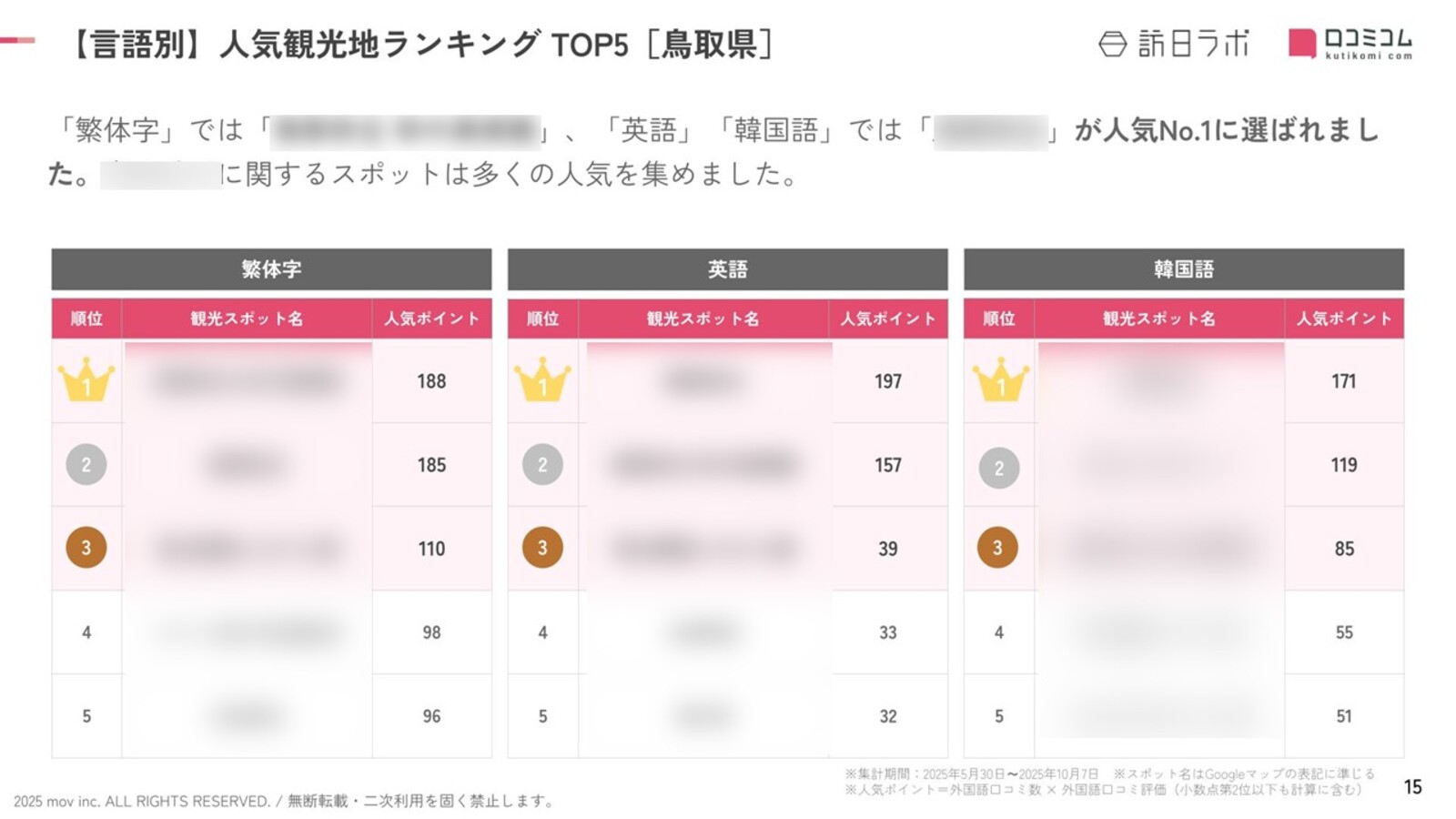 - 調査対象:訪日ラボが独自に選出した鳥取県の観光スポット(計1,218箇所)