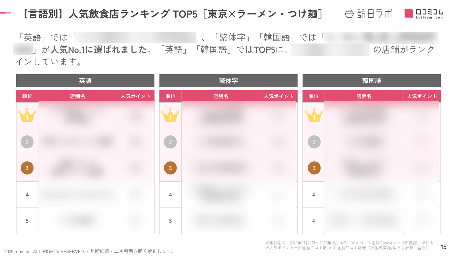 - 調査対象:訪日ラボが独自に選出した東京23区のラーメン・つけ麺店(計500箇所)