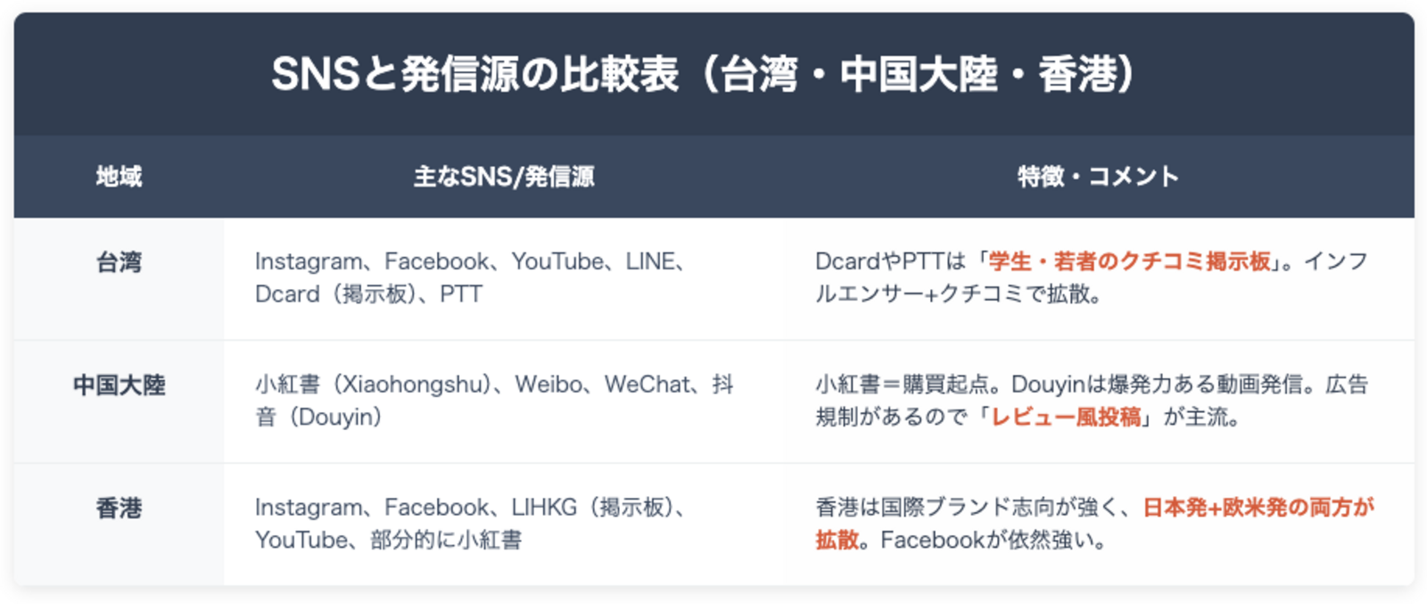 香港はその中間的な位置づけです。InstagramやFacebookといったグローバルSNSが依然として強く、さらにLIHKGという掲示板が若者の間で盛んに使われています。香港は国際ブランド志向が強いので、日本発の商品だけでなく欧米ブランドも同じように拡散されるのが特徴です。特にFacebookはまだ大きな影響力を持っていて、台湾や中国に比べると“クラシックなSNS”が現役で使われている印象です。