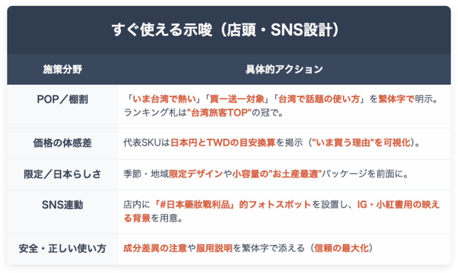 さらにSNSとの連動も忘れずに。店内に「#日本藥妝戰利品」といったフォトスポットを設置して、Instagramや小紅書に投稿しやすい背景を用意しておくと、自然に拡散につながります。