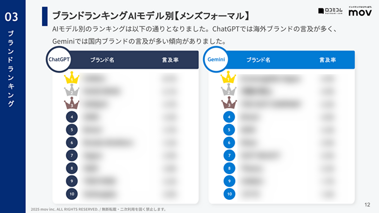調査の結果、両モデルで言及するブランドに特色がありました。ランキング詳細は資料をご覧ください。