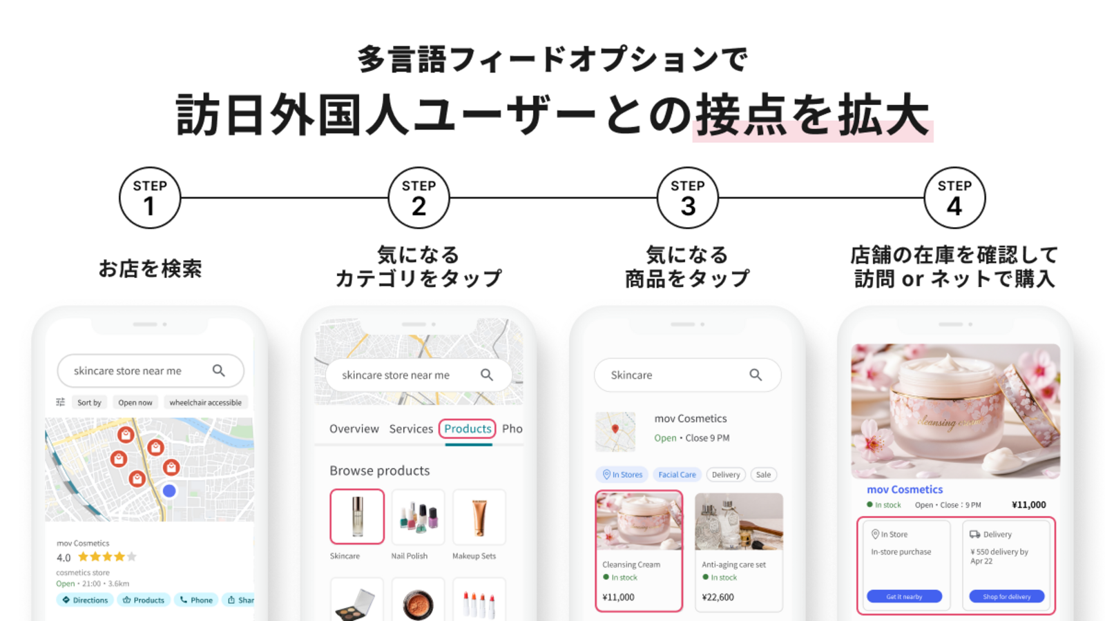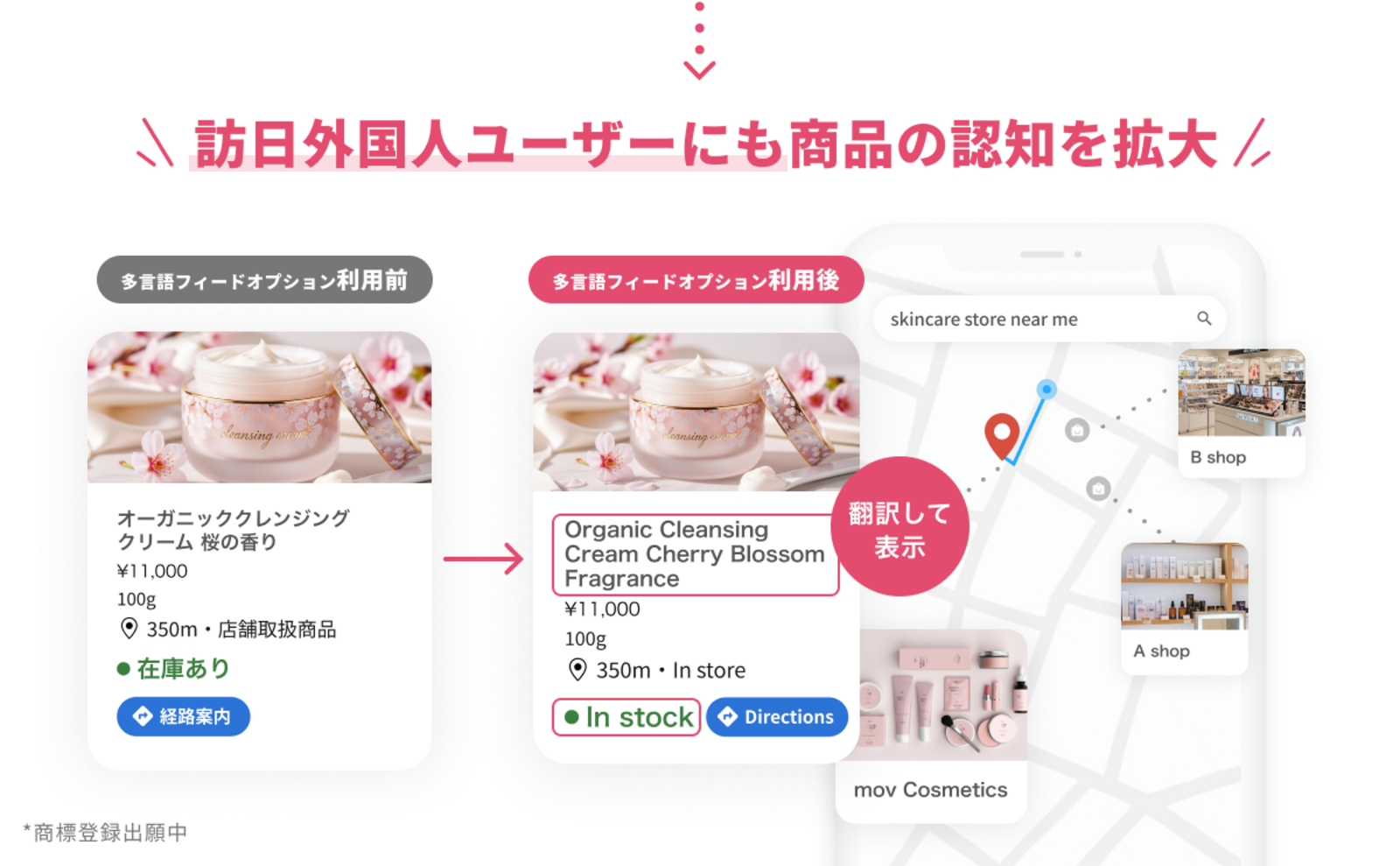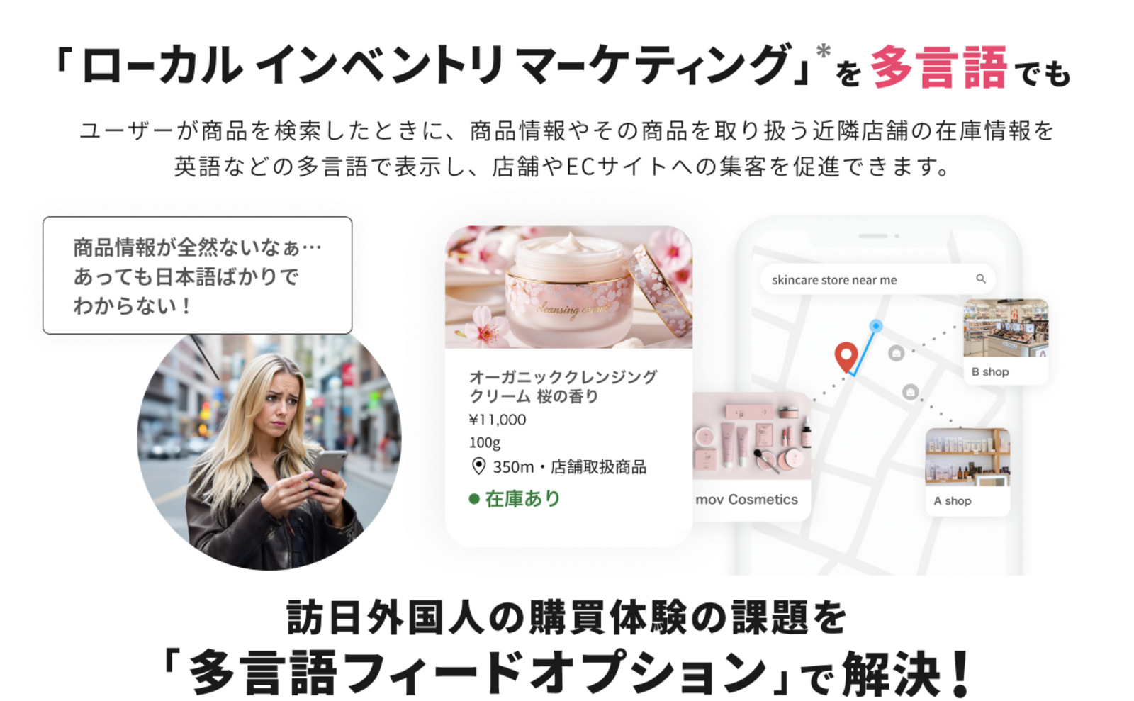 LIMの第一弾として提供している「ライトOMOサービス」に続き、今回の多言語フィードオプションでは、商品情報を英語などの多言語に翻訳し、Google検索・Googleショッピング・Googleマップ上に表示できるようになります。これにより、小売事業者様の商品や店舗の在庫情報が訪日外国人ユーザーの利用言語でも表示されるようになり、商品の認知拡大や実店舗への来店、ECサイトへの誘導を促進します。