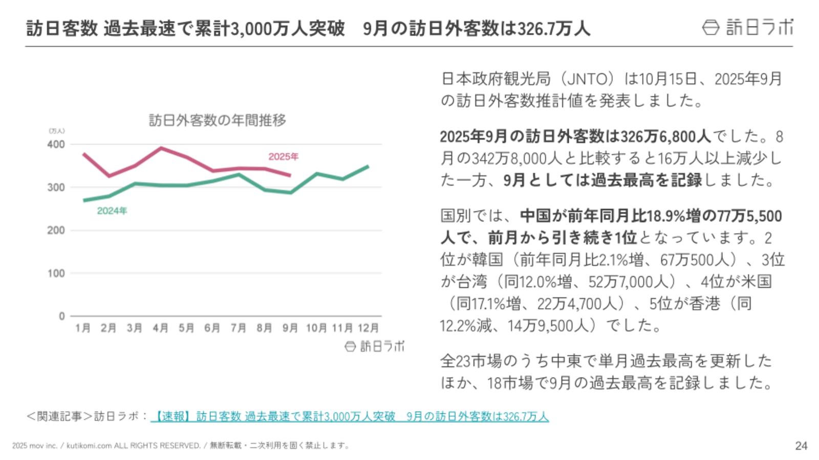 関連記事:【速報】訪日客数 過去最速で累計3,000万人突破 9月の訪日外客数は326.7万人