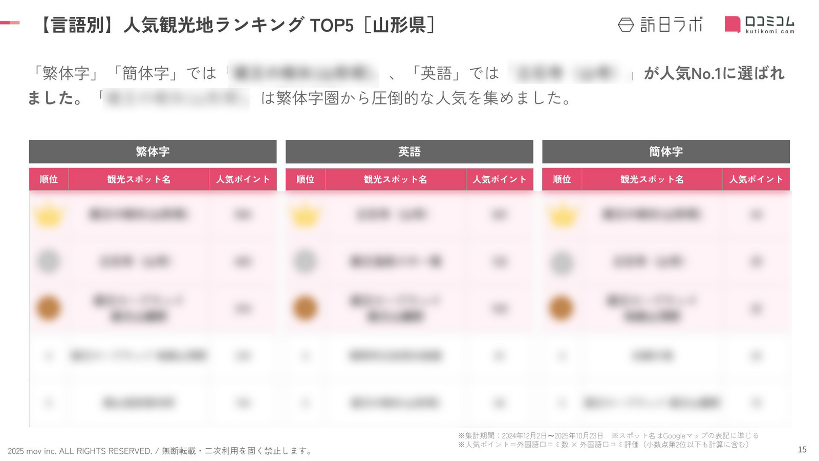 インバウンド人気観光地ランキング[山形県 編]では、以下の内容が明らかになりました。