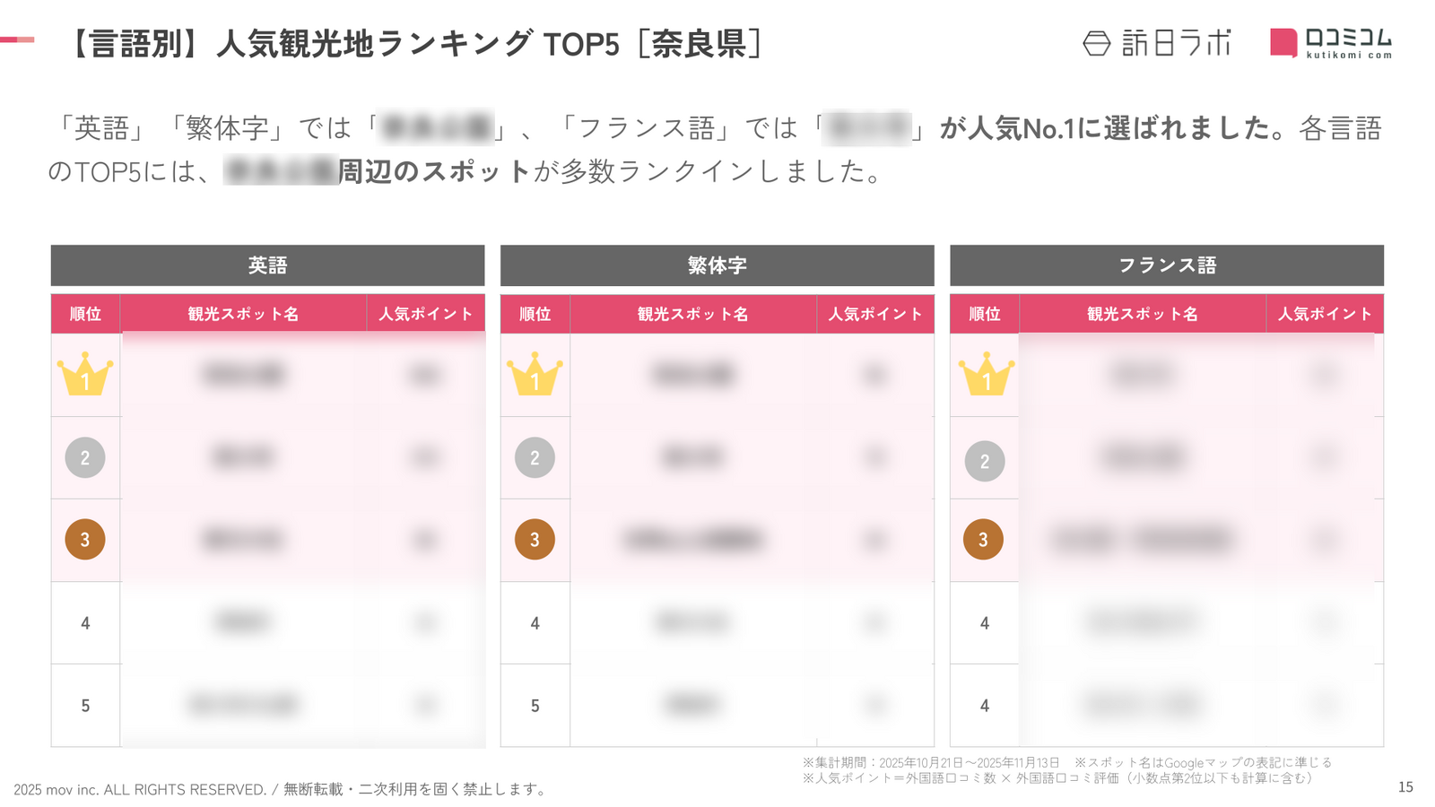 - 調査対象:訪日ラボが独自に選出した奈良県の観光スポット(計2,506箇所)