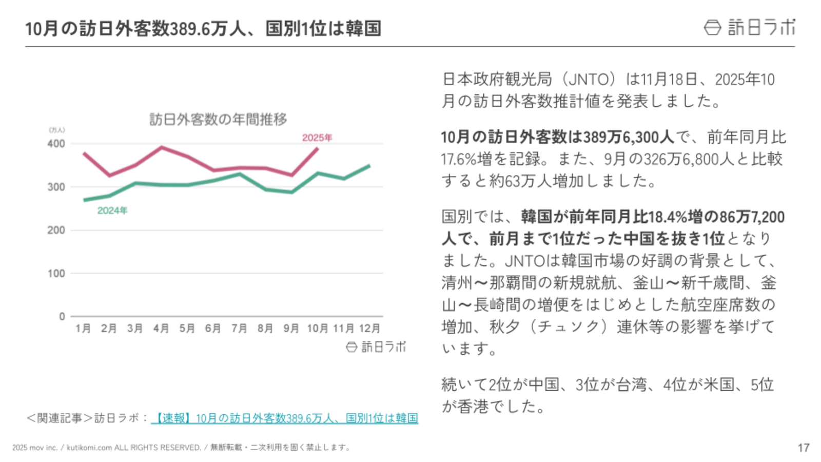 関連記事:【速報】10月の訪日外客数389.6万人、国別1位は韓国