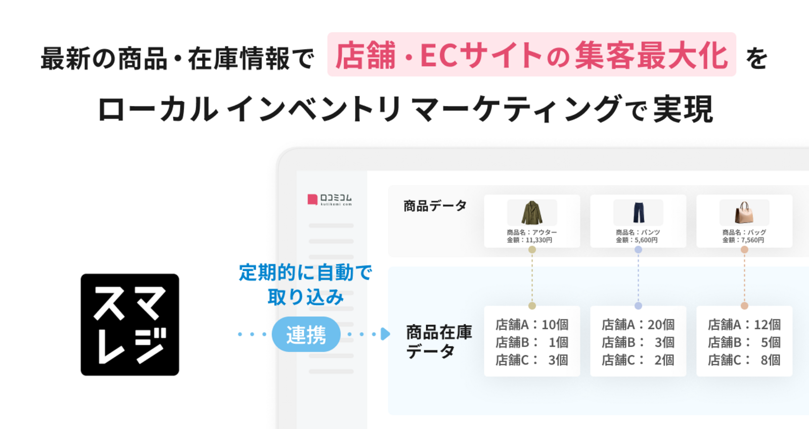 店舗向け集客一元化プラットフォーム「口コミコム 」および業界最大級のインバウンド業界メディア「訪日ラボ」を運営する株式会社mov(代表取締役:渡邊 誠、本社:東京都渋谷区、以下mov)は、小売業界向けに提唱するマーケティング手法「ローカルインベントリマーケティング」(Local Inventory Marketing、略称:LIM)をより簡易に実現するためのエコシステム構築に向けた商品在庫データ連携を開始し、クラウドPOS「スマレジ」(https://smaregi.jp/)との公式機能連携を発表しました。