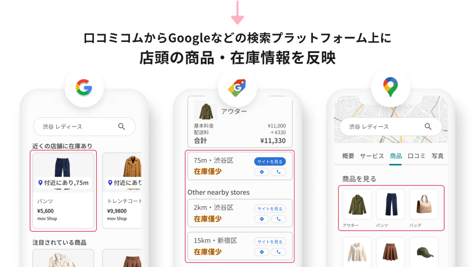 ユーザーが商品を検索した際に、近くの店舗での在庫情報や店舗情報、さらには自社ECサイトへの購入導線をGoogleなどの検索プラットフォーム上に表示させます。