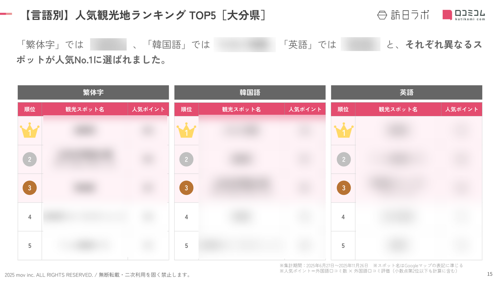 - 調査対象:訪日ラボが独自に選出した大分県の観光スポット(計1,602箇所)
