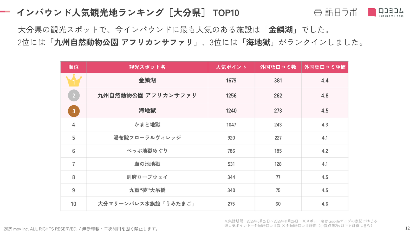 訪日ラボ・口コミコムが独自に調査した『インバウンド人気観光地ランキング』大分県 編。