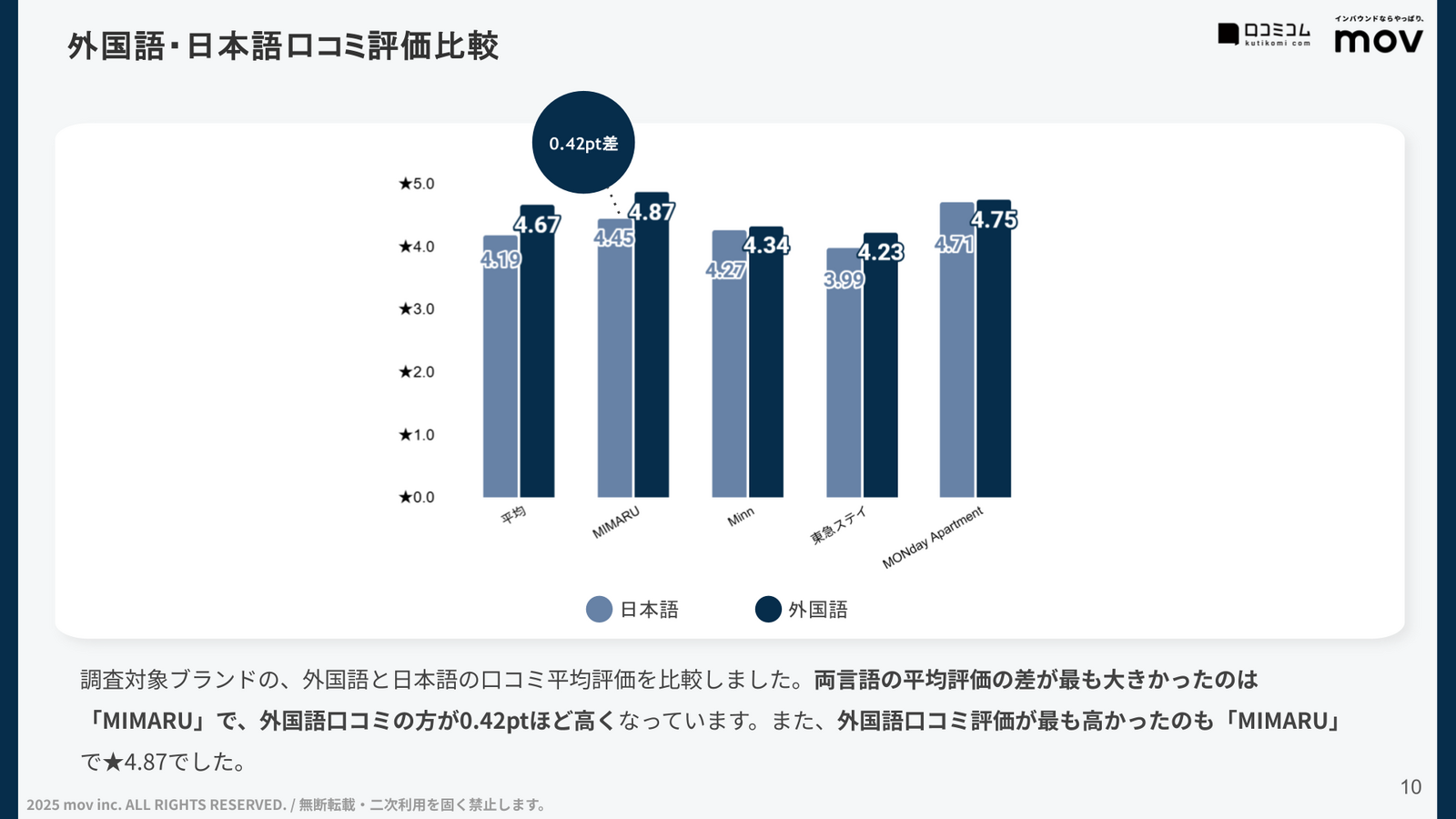 各ブランドの日本語口コミと外国語口コミの平均評価を比較したところ、最も差が大きかったのは「MIMARU」でした。「MIMARU」では、日本語の口コミ平均評価★4.45に対し、外国語では★4.87と0.42ポイント高い評価を獲得していました。