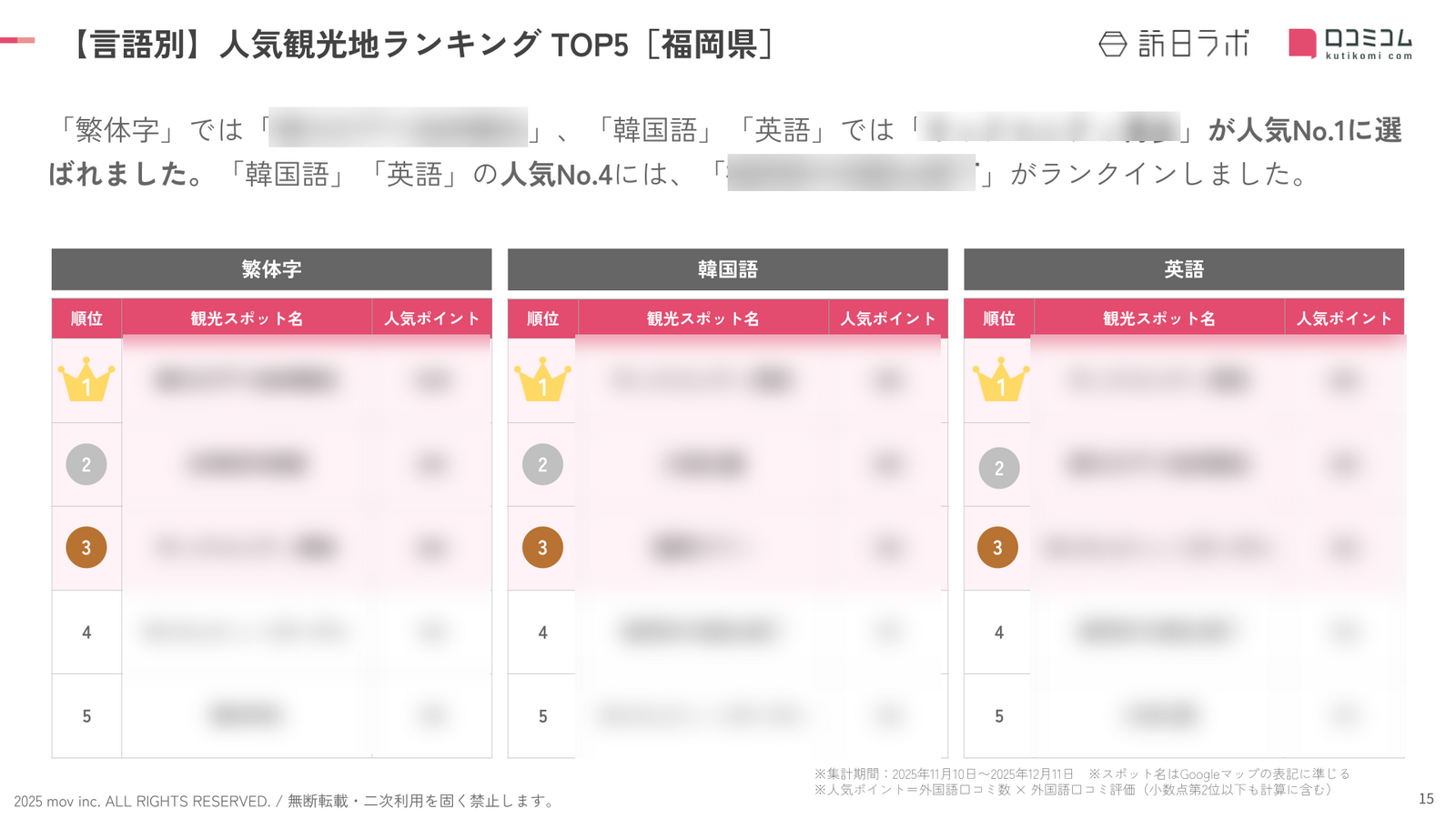 - 調査対象:訪日ラボが独自に選出した福岡県の観光スポット(計2,522箇所)