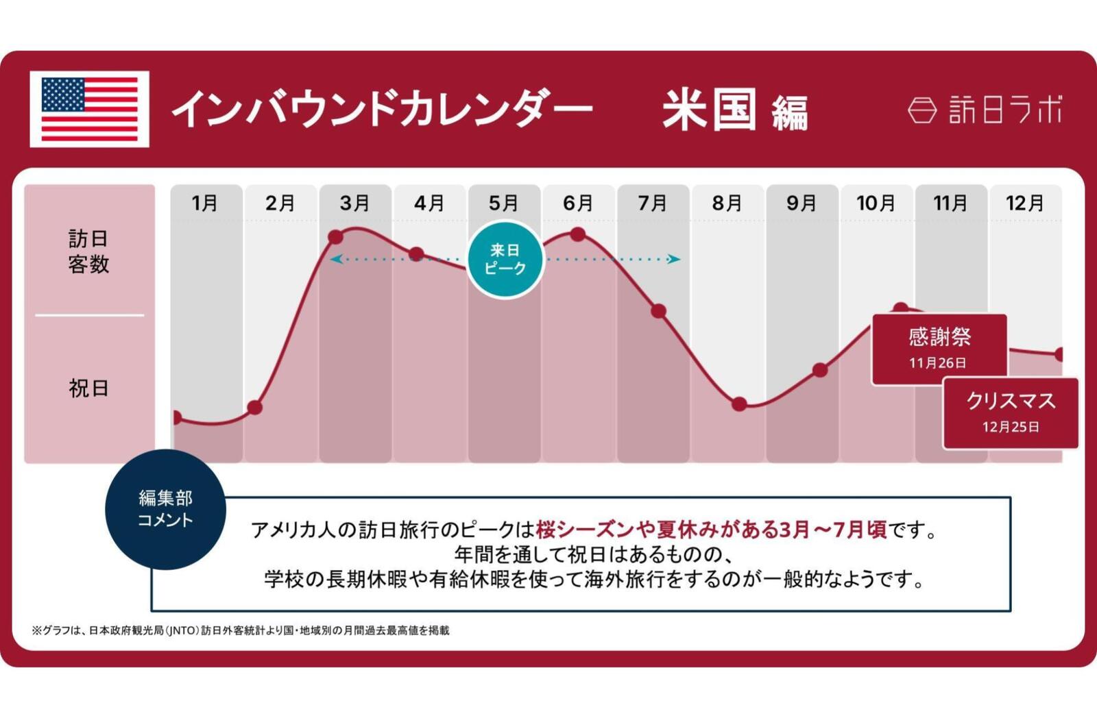 アメリカは訪日インバウンドにおいて主要な市場の一つであり、訪日客数や消費額の割合において常に上位を占めています。そのため、祝日や連休など、旅行需要が高まりやすい時期を把握しておくことが重要なポイントとなります。
