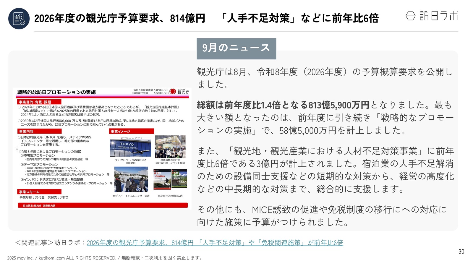 訪日ラボを運営する株式会社movでは、観光業界やインバウンドの動向をまとめたレポート【インバウンド情報まとめ】を毎月2回発行しています。