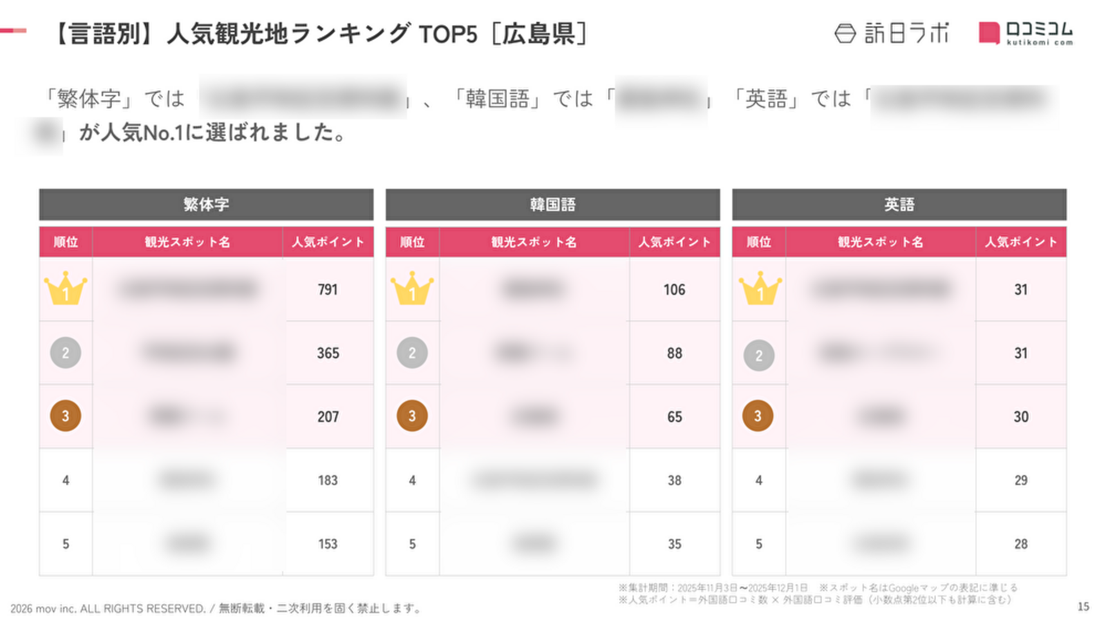 - 調査対象:訪日ラボが独自に選出した広島県の観光スポット(計1,755箇所)
