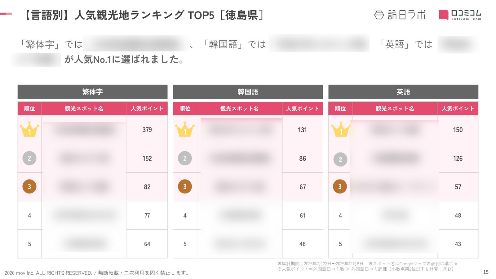 - 調査対象:訪日ラボが独自に選出した徳島県の観光スポット(計1,360箇所)