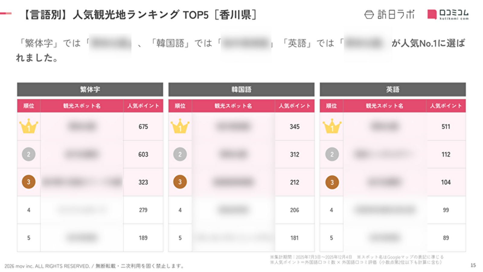 - 調査対象:訪日ラボが独自に選出した香川県の観光スポット(計1,644箇所)