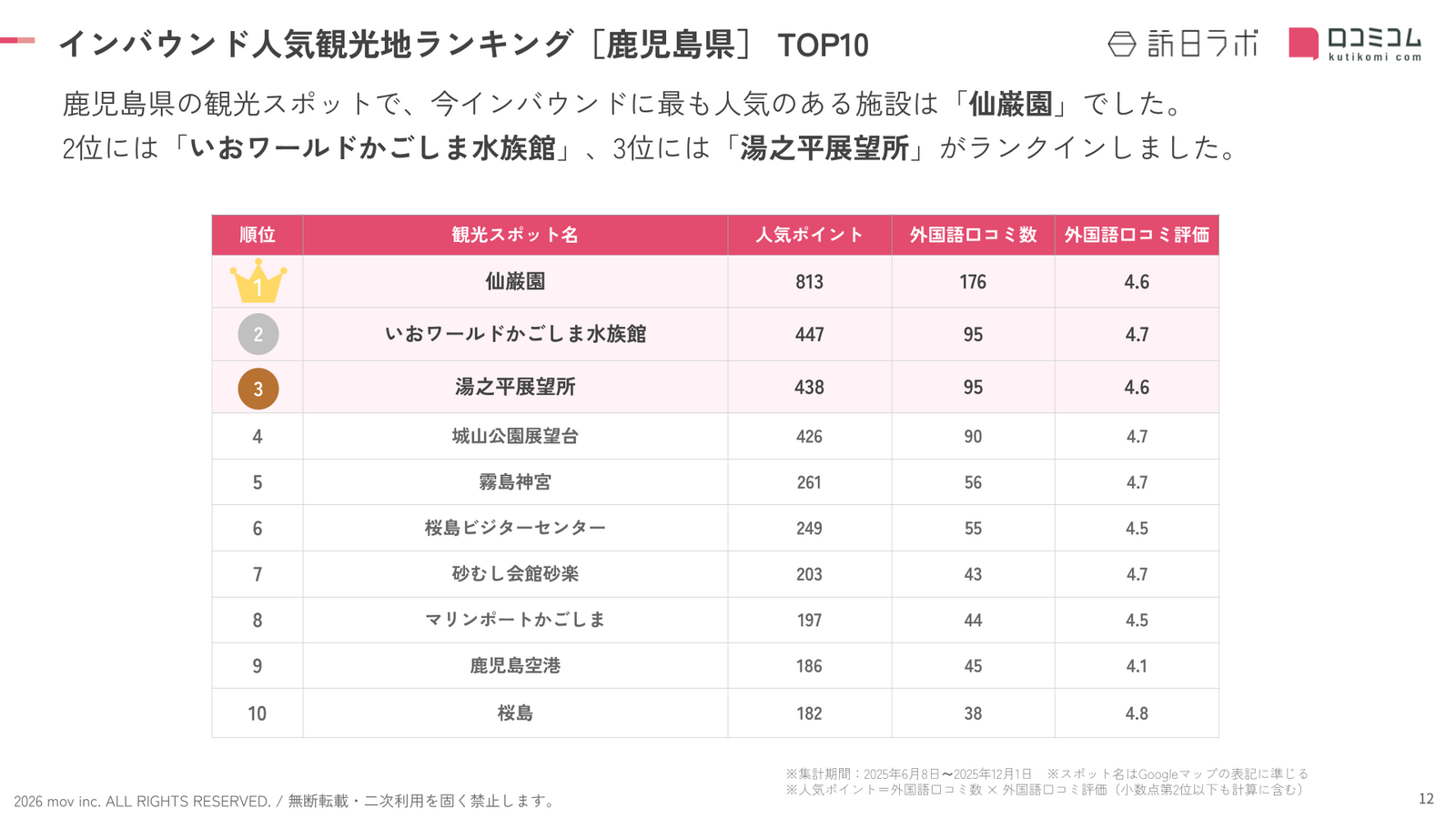 インバウンド人気観光地ランキング[鹿児島県編]では、以下の内容が明らかになりました。