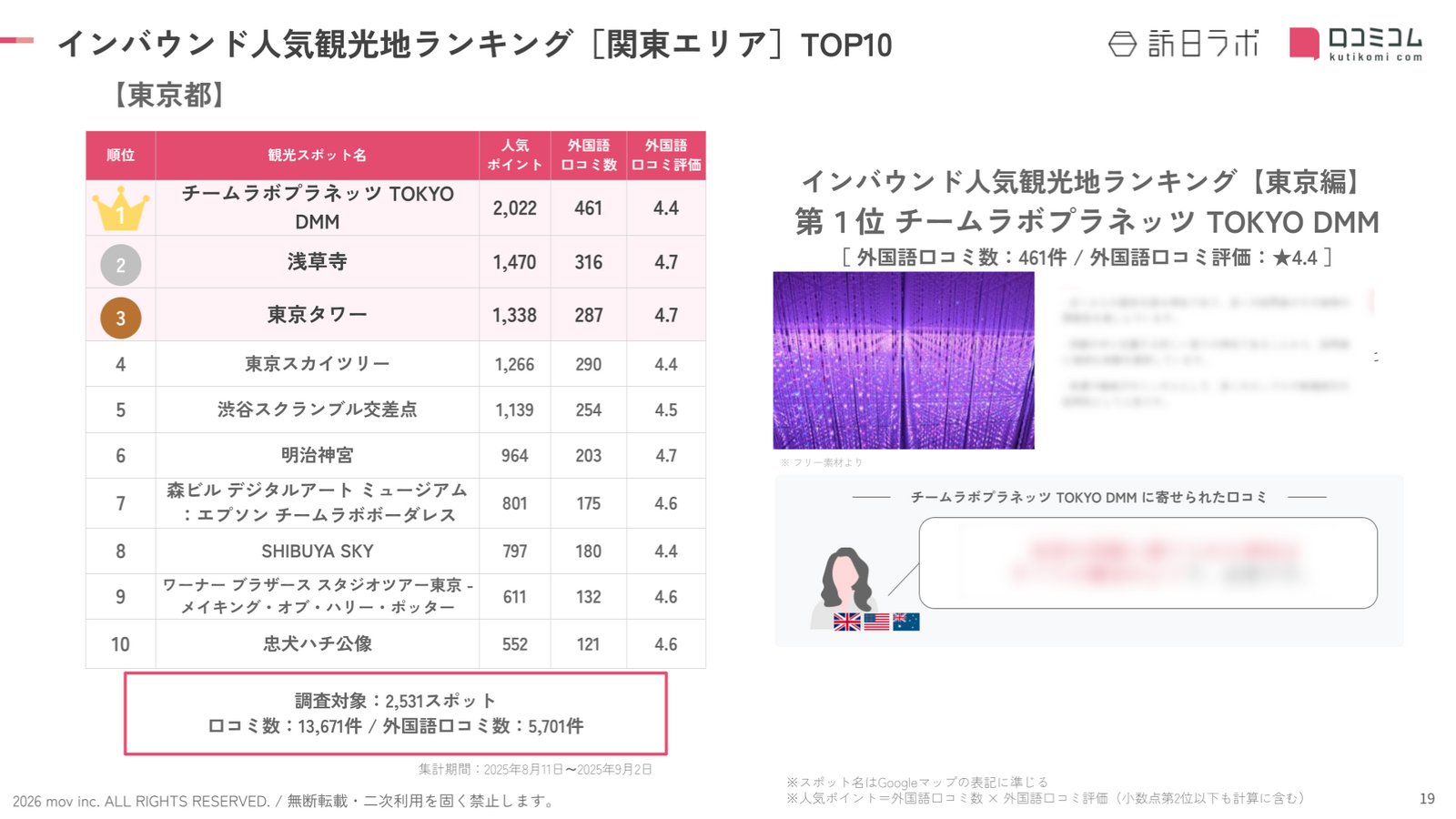訪日ラボが最新の口コミデータを元に独自調査・発表している『インバウンド人気観光地ランキング』。全国の観光地に寄せられた口コミをもとに、訪日客の注目観光スポットや人気の理由を分析しています。