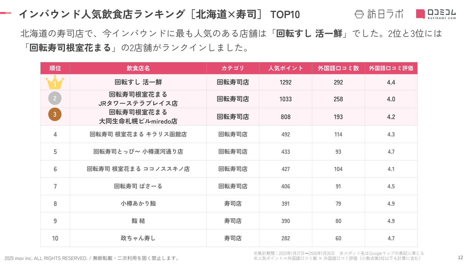 - 調査対象:訪日ラボが独自に選出した北海道×寿司の飲食店(計862箇所)