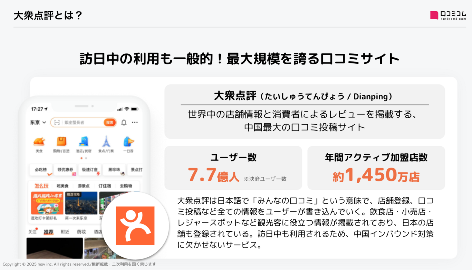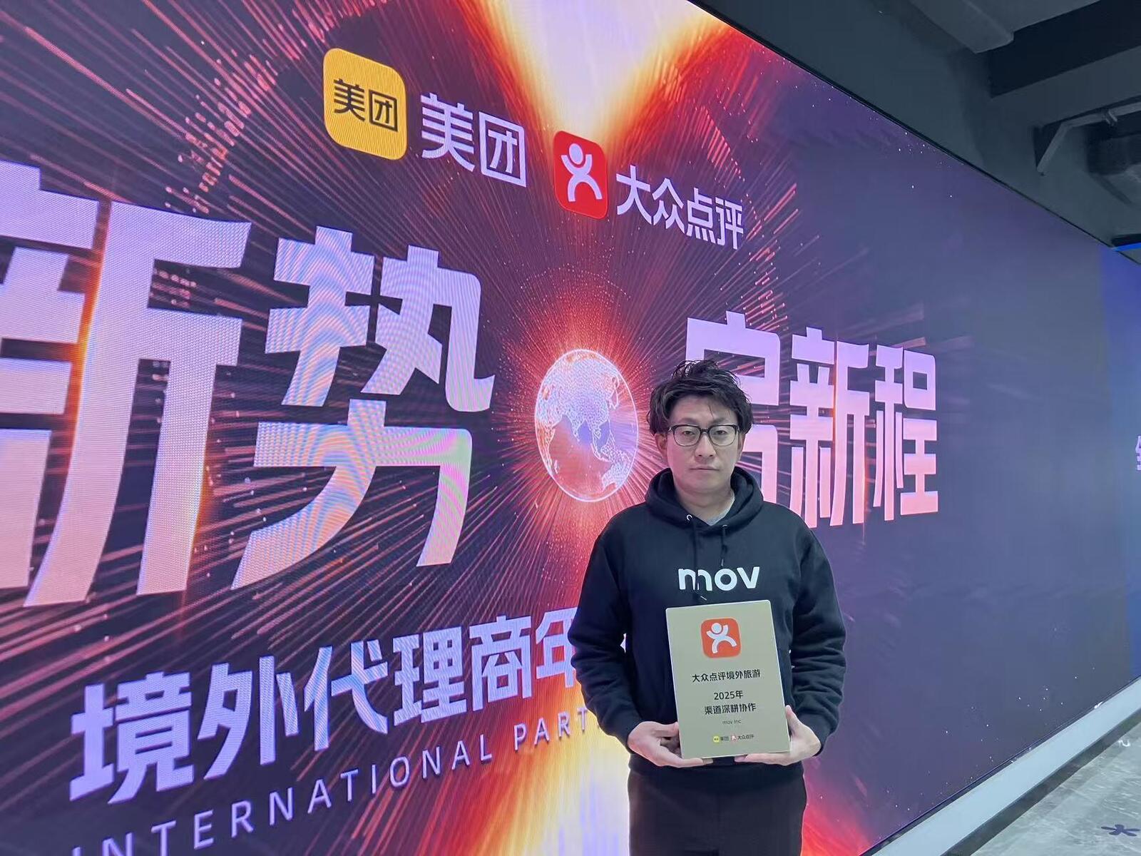 店舗向け集客一元化プラットフォーム「口コミコム」および業界最大級のインバウンドビジネスメディア「訪日ラボ」を運営する株式会社mov(代表取締役:渡邊 誠、本社:東京都渋谷区、以下mov)は、美団(読み:びだん、メイトゥアン、本社:中国・北京市)が提供する中国⽣活情報プラットフォーム「大衆点評(読み:たいしゅうてんぴょう)」の公式パートナーとして、この度「チャネル開拓協業貢献賞」を受賞したことをお知らせいたします。