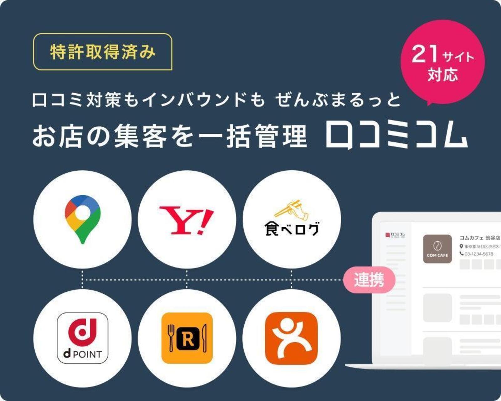 口コミコムは、国内外の口コミサイトを“もっと”売上に変える「店舗向け集客一元化プラットフォーム」です。