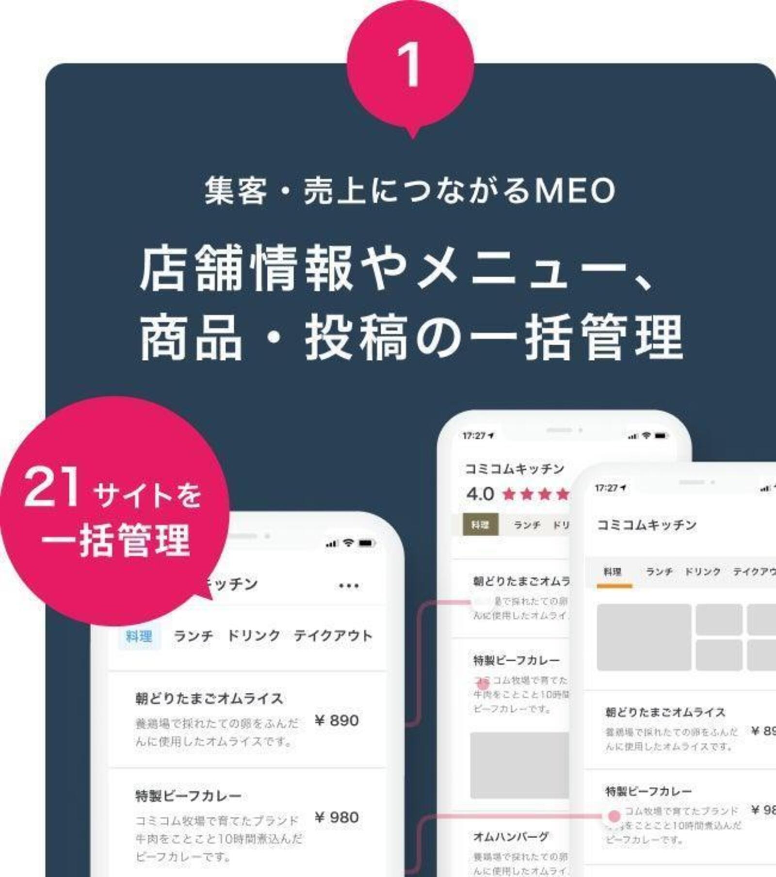 <口コミコム特徴その1>自社HPを含む31サイトと連携!店舗情報・メニューや商品・投稿を一括管理