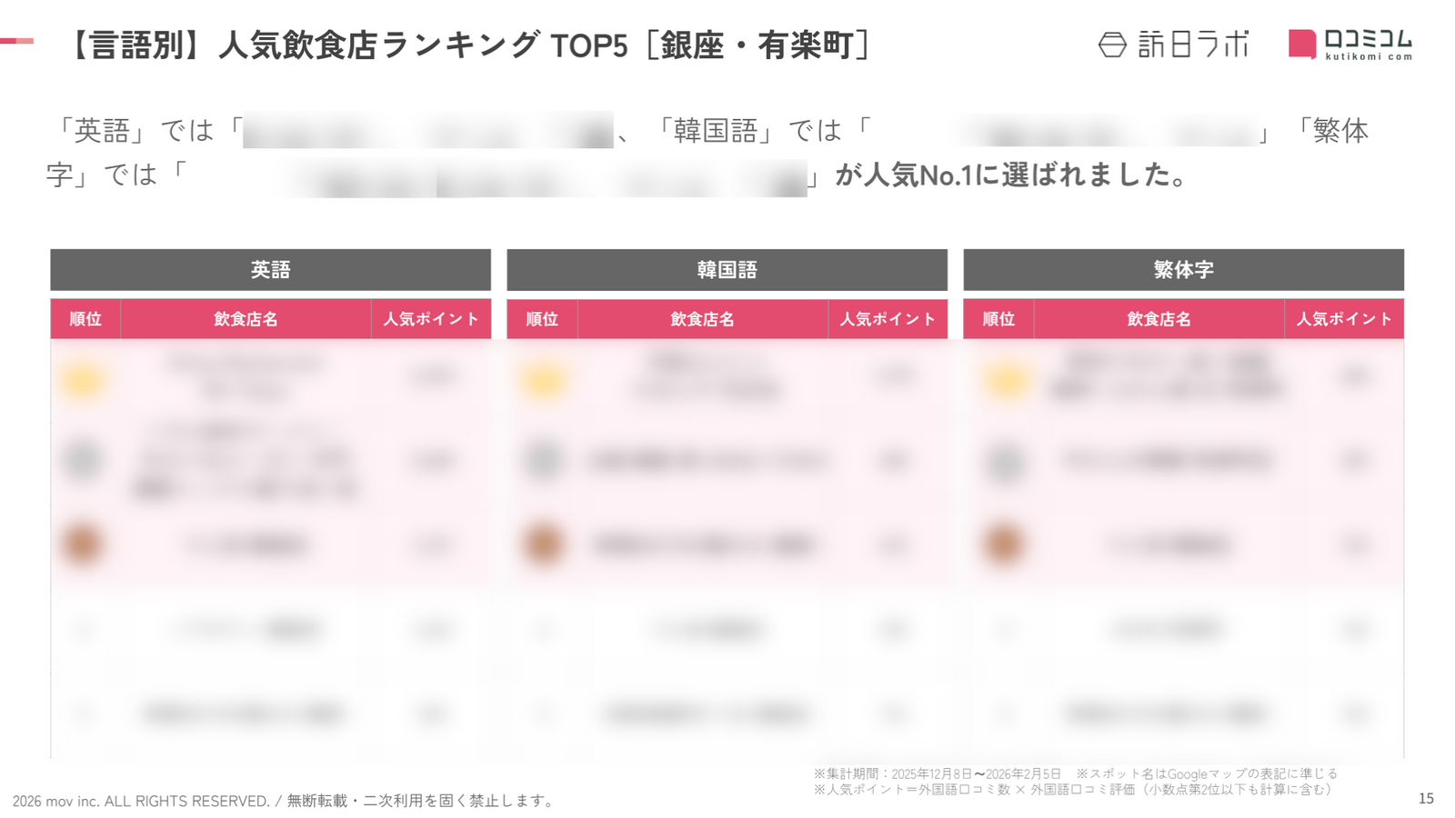 「英語」「韓国語」「繁体字」では異なる飲食店が人気No.1に選ばれました。