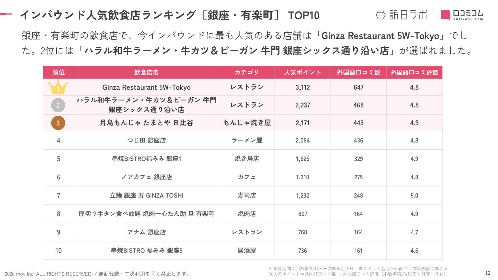 インバウンド人気飲食店ランキング[銀座編]では、以下の内容が明らかになりました。