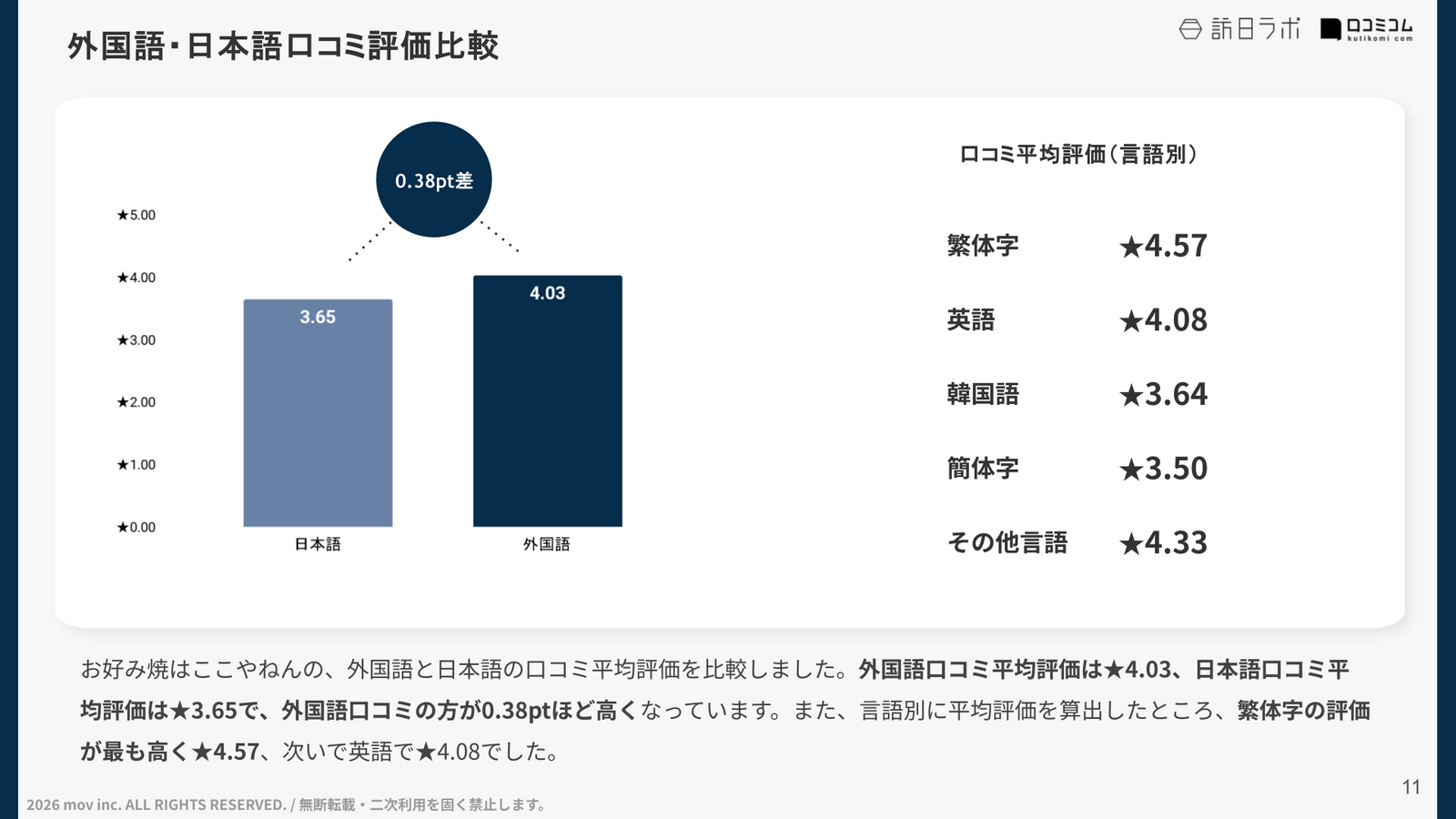 レポートをくわしく見る(無料)外国語口コミ平均評価は★4.03、繁体字の評価が最も高く★4.57
