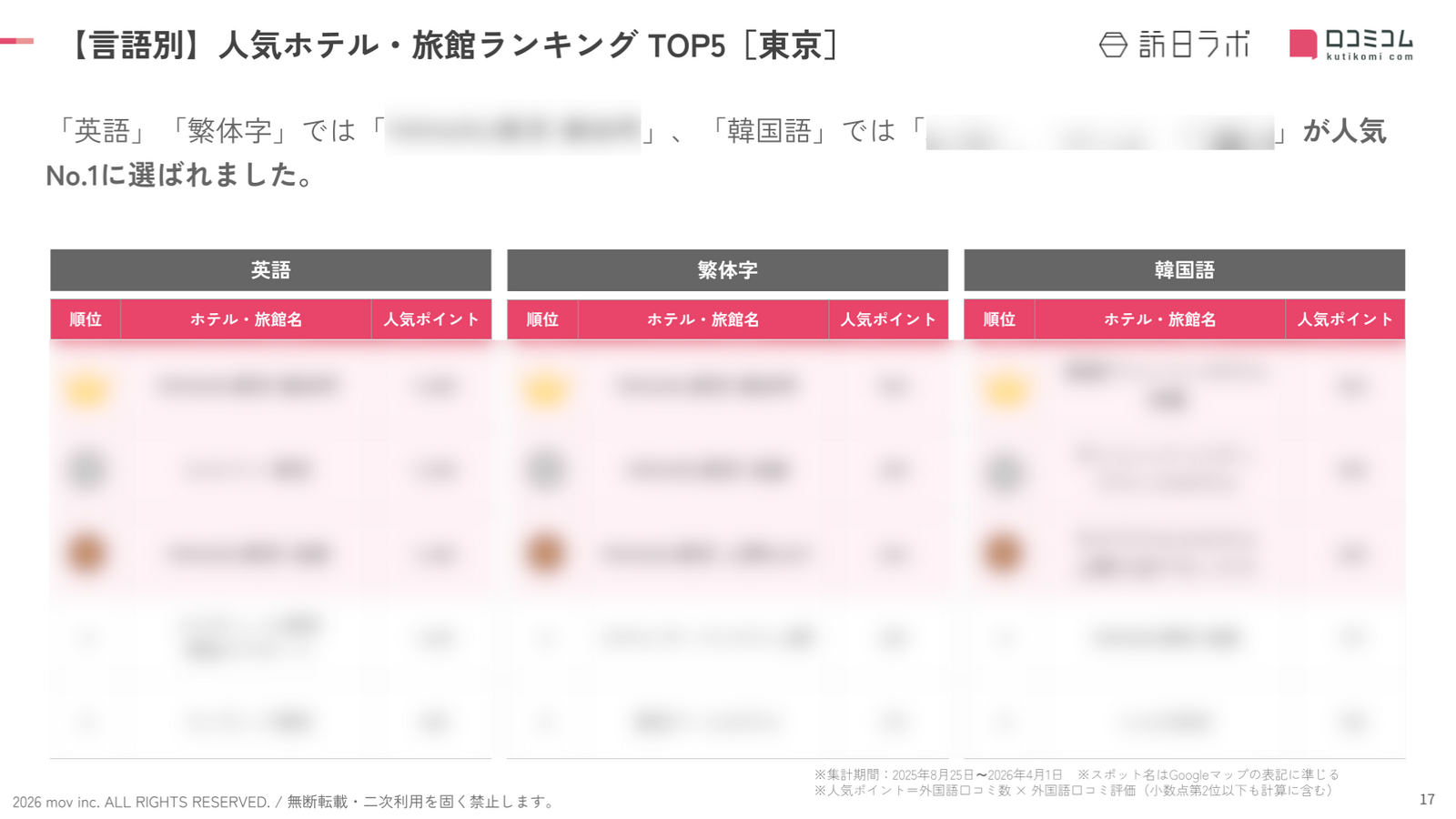 各言語圏での人気ホテル・旅館は、レポートにてご確認ください。