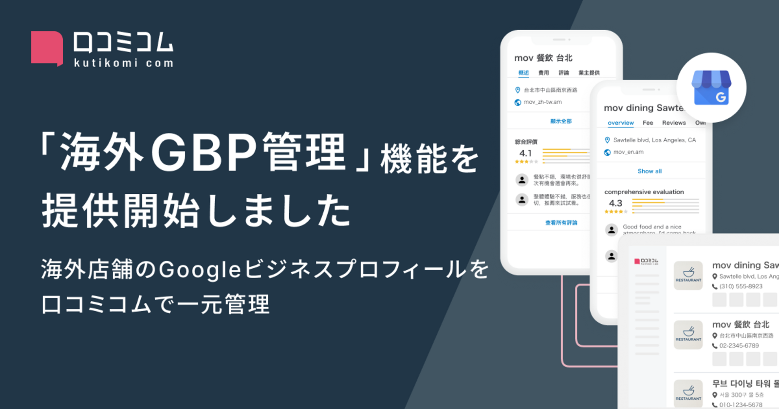 店舗向け集客一元化プラットフォーム「口コミコム」および業界最大級のインバウンド業界メディア「訪日ラボ」を運営する株式会社mov(代表取締役:渡邊 誠、本社:東京都渋谷区、以下mov)は、海外店舗のGoogleビジネスプロフィール(以下、海外GBP)や口コミ分析を「口コミコム」内で管理、実行できる新機能「海外GBP管理」の提供を開始いたしました。