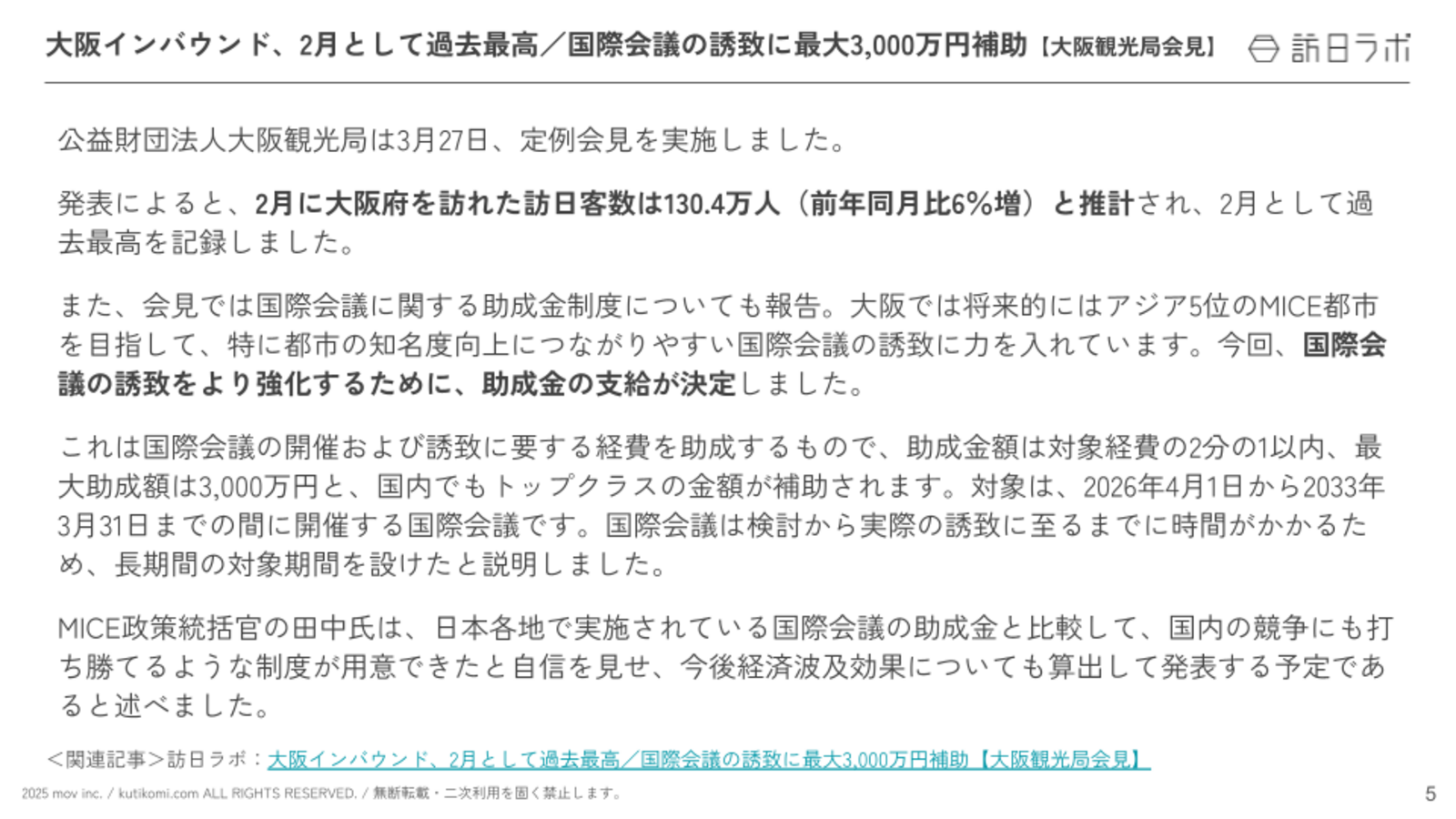 関連記事:大阪インバウンド、2月として過去最高/国際会議の誘致に最大3,000万円補助【大阪観光局会見】