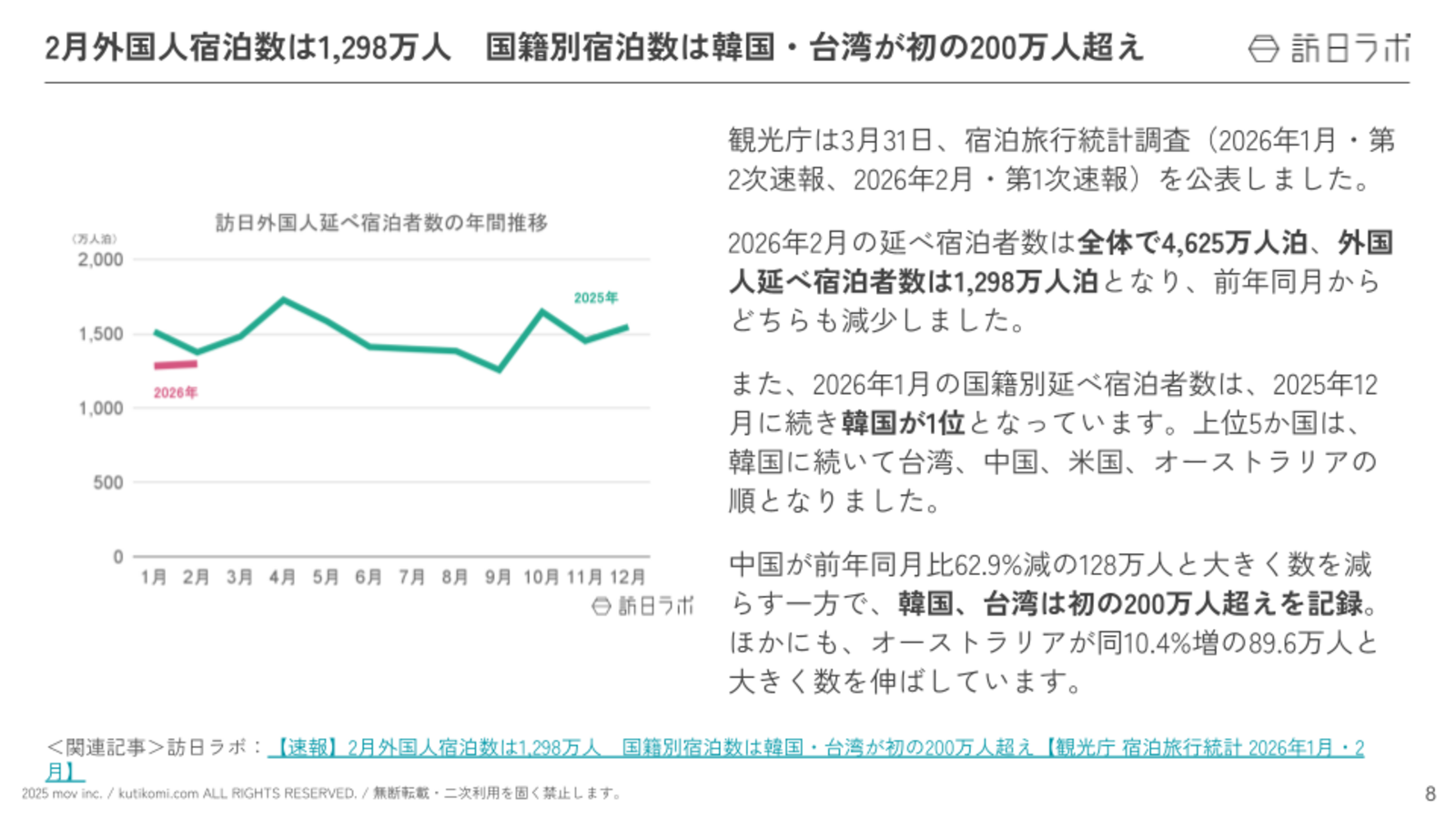 関連記事:【速報】2月外国人宿泊数は1,298万人 国籍別宿泊数は韓国・台湾が初の200万人超え【観光庁 宿泊旅行統計 2026年1月・2月】
