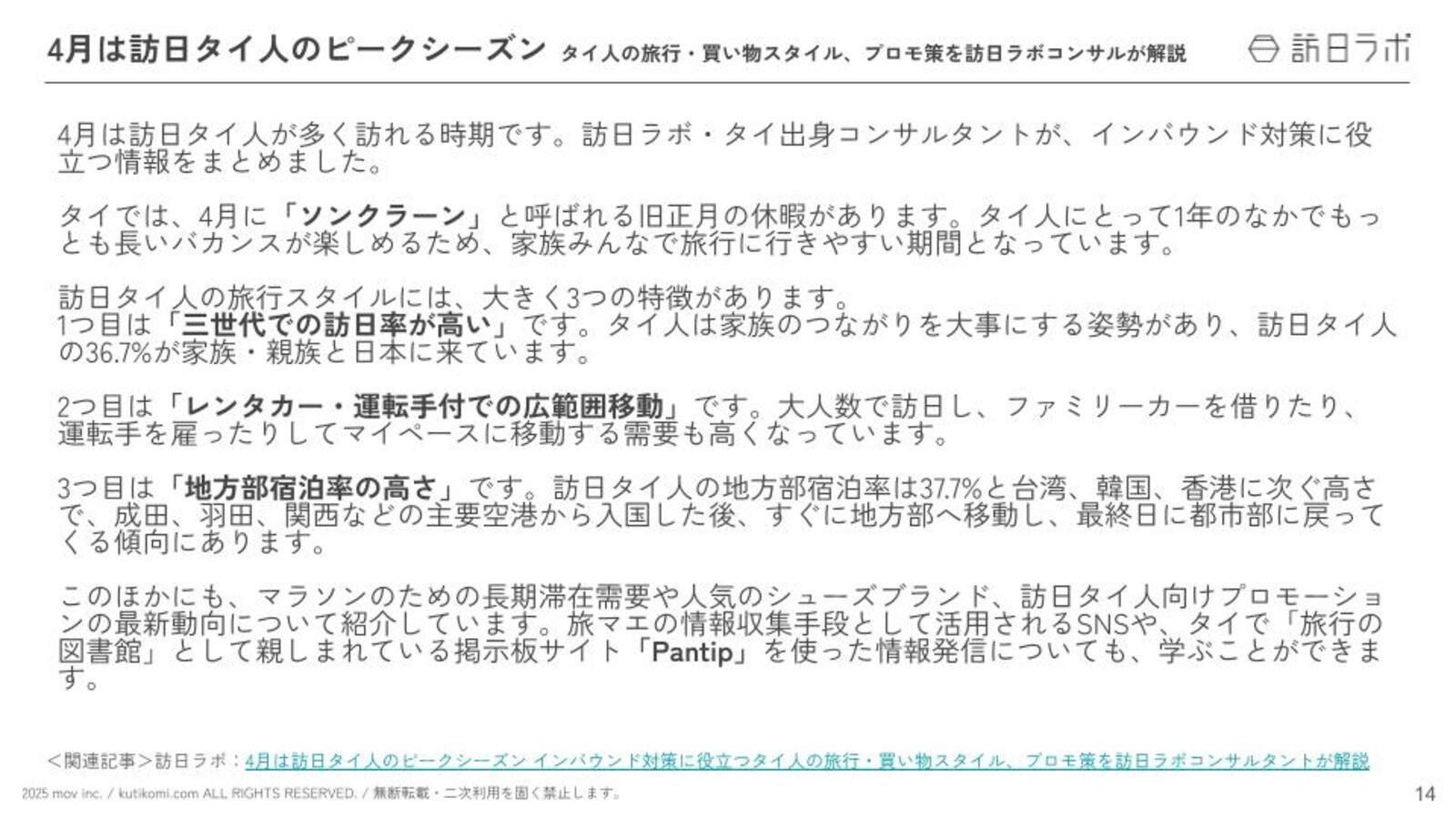 このほかにも、マラソンのための長期滞在需要や人気のシューズブランド、訪日タイ人向けプロモーションの最新動向について紹介しています。旅マエの情報収集手段として活用されるSNSや、タイで「旅行の図書館」として親しまれている掲示板サイト「Pantip」を使った情報発信についても、学ぶことができます。