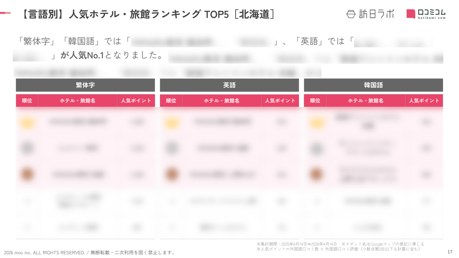 各言語圏での人気ホテル・旅館は、レポートにてご確認ください。