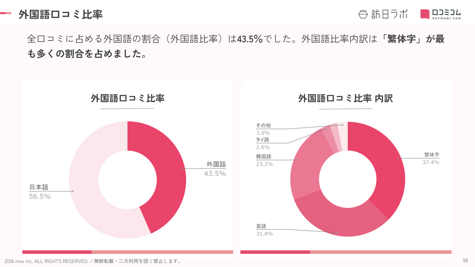 口コミの外国語比率は43.5%で、外国語内訳では「繁体字」が一番多くなっています。