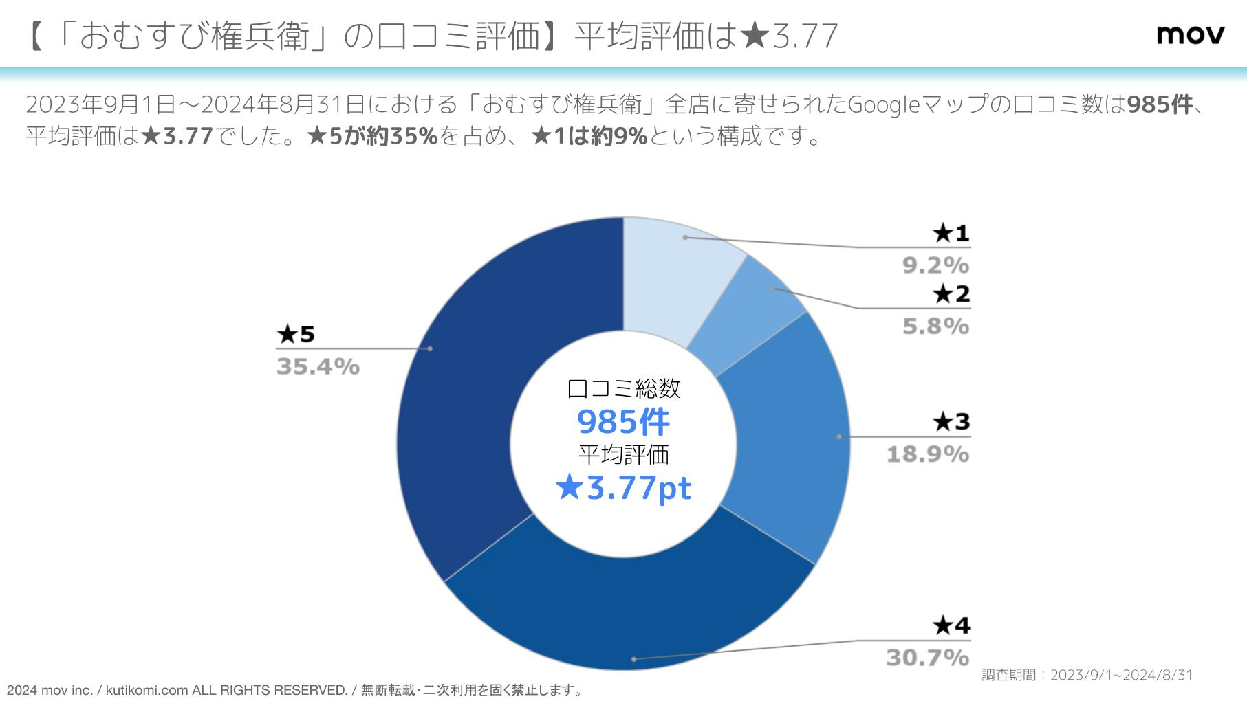 2023年9月1日〜2024年8月31日における 「おむすび権兵衛」全店に寄せられたGoogleマップの口コミ数は985件 、 平均評価は★3.77 でした。