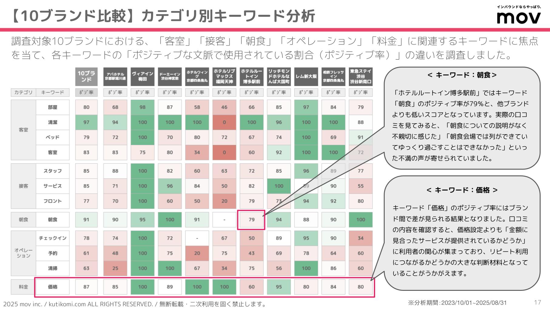 こちらの表では、調査対象10ブランドにおける「客室」「接客」「朝食」「オペレーション」「料金」に関連するキーワードに焦点を当て、各キーワードの「ポジティブな文脈で使用されている割合(ポジティブ率)」の違いを調査しています。
