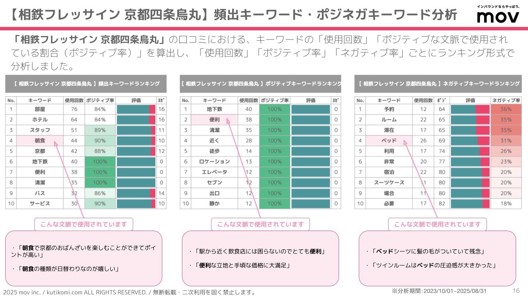 こちらの表では「相鉄フレッサイン 京都四条烏丸」の口コミにおける、キーワードの「使用回数」「ポジティブな文脈で使用されている割合(ポジティブ率)」を算出し、「使用回数」「ポジティブ率」「ネガティブ率」ごとにランキング形式で分析しています。