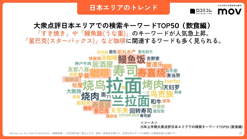 2025年上半期の検索キーワードTOP50(飲食編)では、 「すき焼き」 や「鰻魚飯(うな重)」の人気が急上昇。